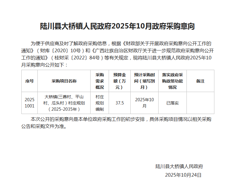为便于供应商及时了解政府采购信息,根据《财政部关于开展政府采购意向公开工作的通知》(财库〔2020〕10号)和《广西壮族自治区财政厅关于进一步规范政府采购意向公开工作的通知》(桂财采〔2022〕84号)等有关规定,现将******人民政府2025年10月采购意向公开如下: