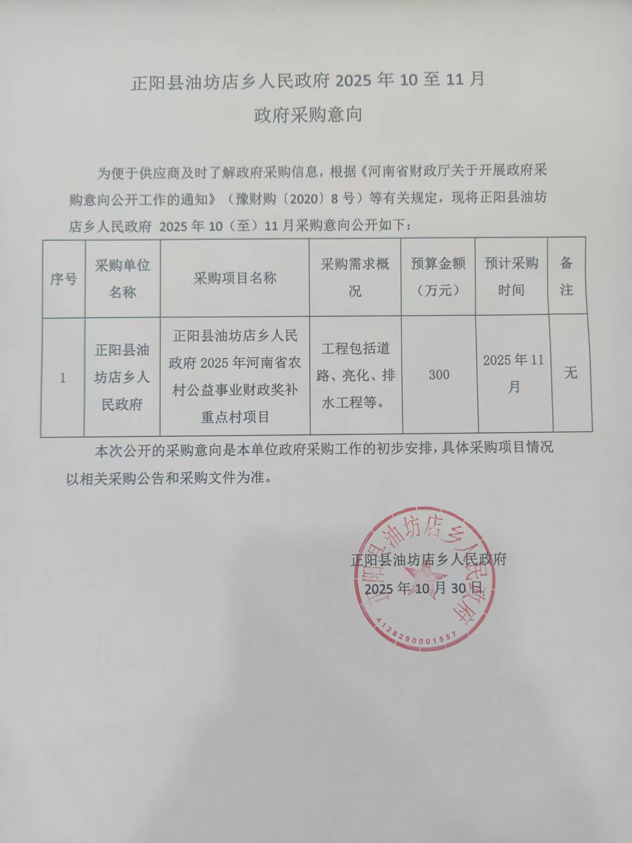为便于供应商及时了解政府采购信息,根据《河南省财******人民政府 2025年10(至)11月采购意向公开如下: