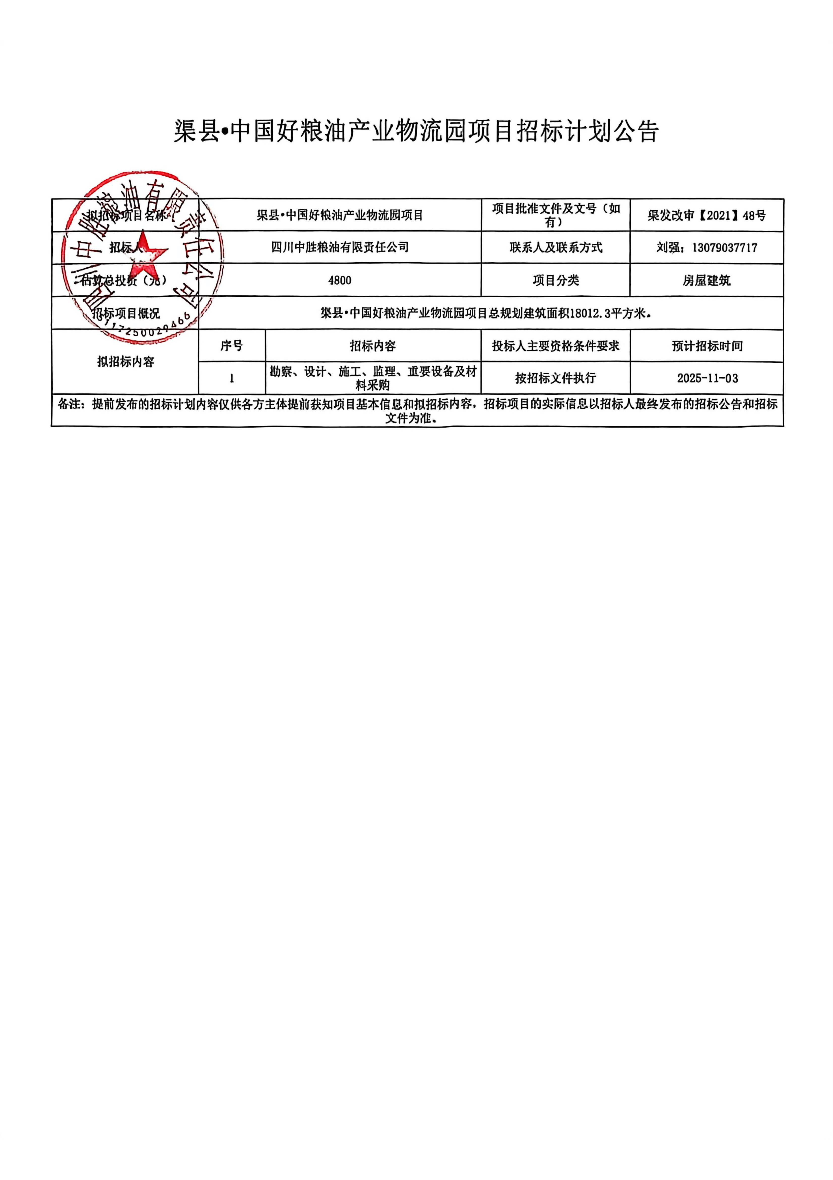 | 拟招标项目名称 | 渠县?中国好粮油产业物流园项目 | 项目批准文件及文号(如有) | 渠发改审【2021】48号 | ||||||