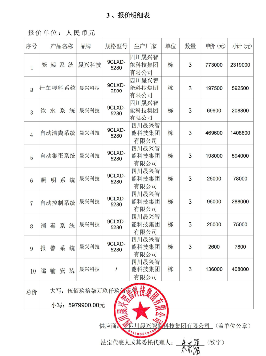 | 1、采购内容:购置7万羽自动化智能化养鸡设备 2、资金来源:财政资金 3、质量标准:符合国家和行业现行标准规定,满足业主需求 4、供货期:合同签订后 60日历天内供货安装调试完毕 5、招标范围:采购清单内全部内容(详见招标文件) 6、标段划分:本项目共划分为一个标段 7、合同履行期限:60日历天 | |||||||||||||||||||||||||||||||