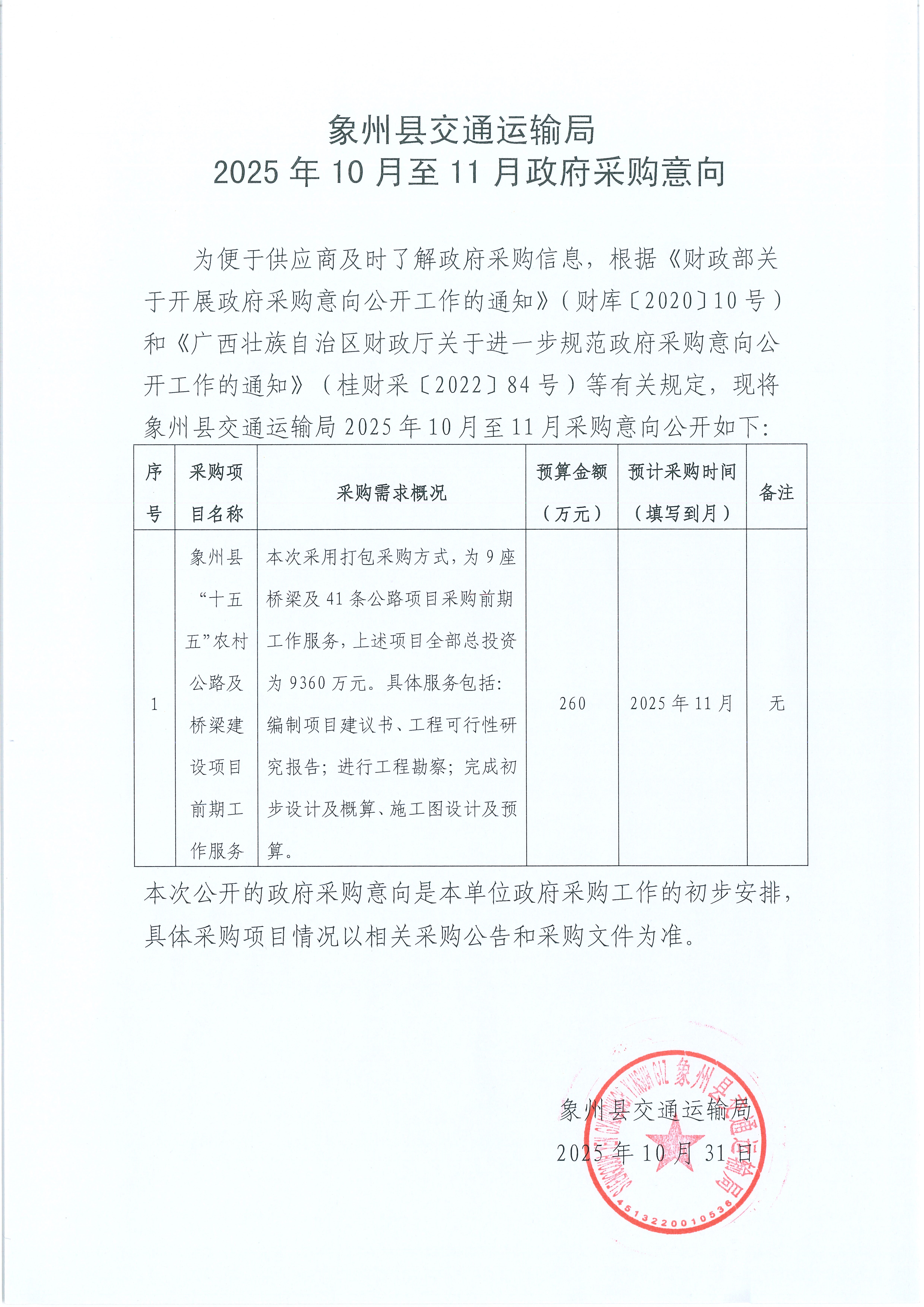 为便于供应商及时了解政府采购信息,根据《财政部关于开展政府采购意向公开工作的通知》(财库〔2020〕10号)和《广西壮族自治区财政厅关于进一步规范政府采购意向公开工作的通知》(桂财采〔2022〕84号)等有关规定,现将象州县交通运输局2025年10月至11月采购意向公开如下:
