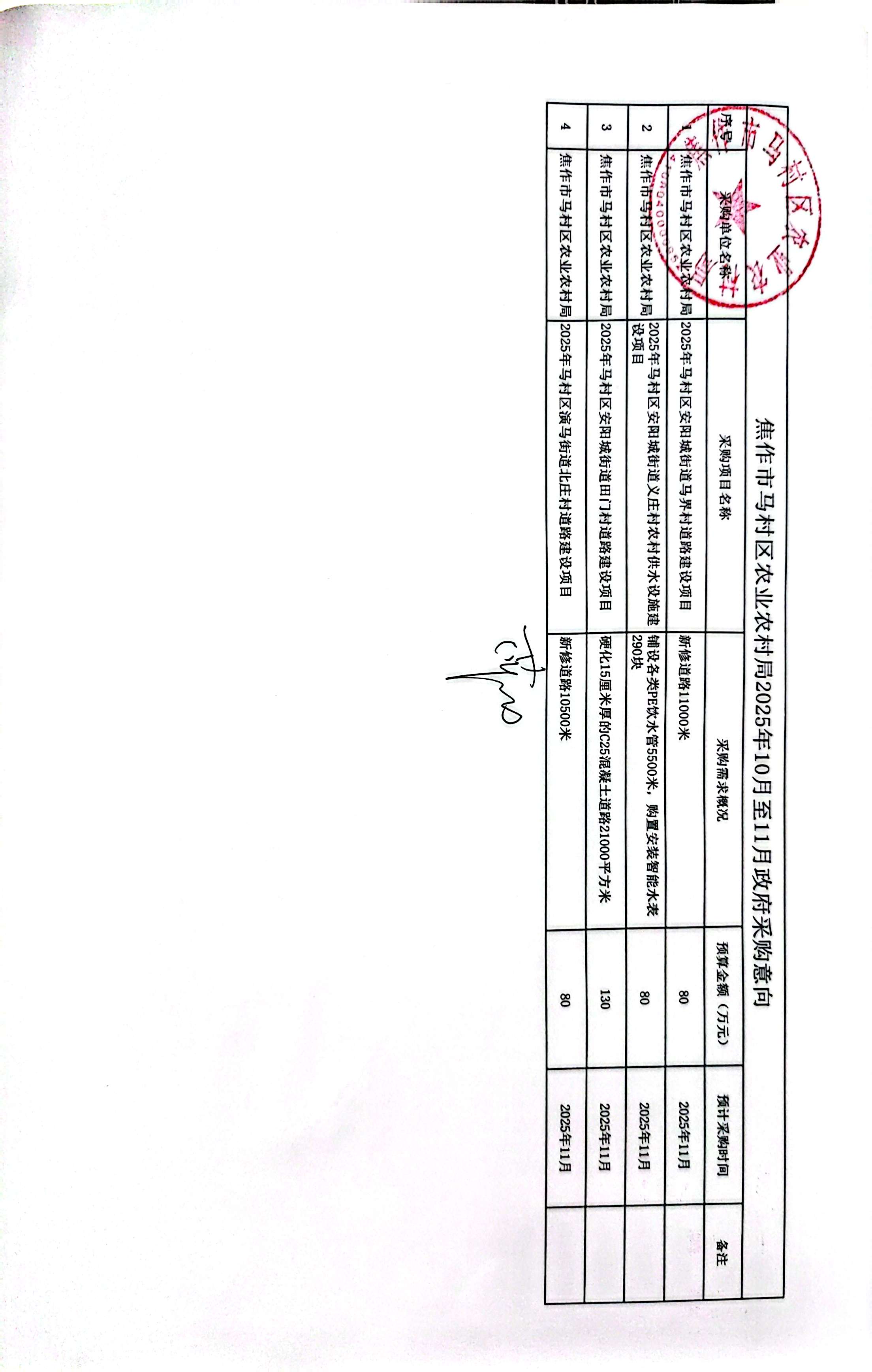 | 1 | ******农村局 | ******街道马界村道路建设项目 | 80.00 | 2025年11月 |