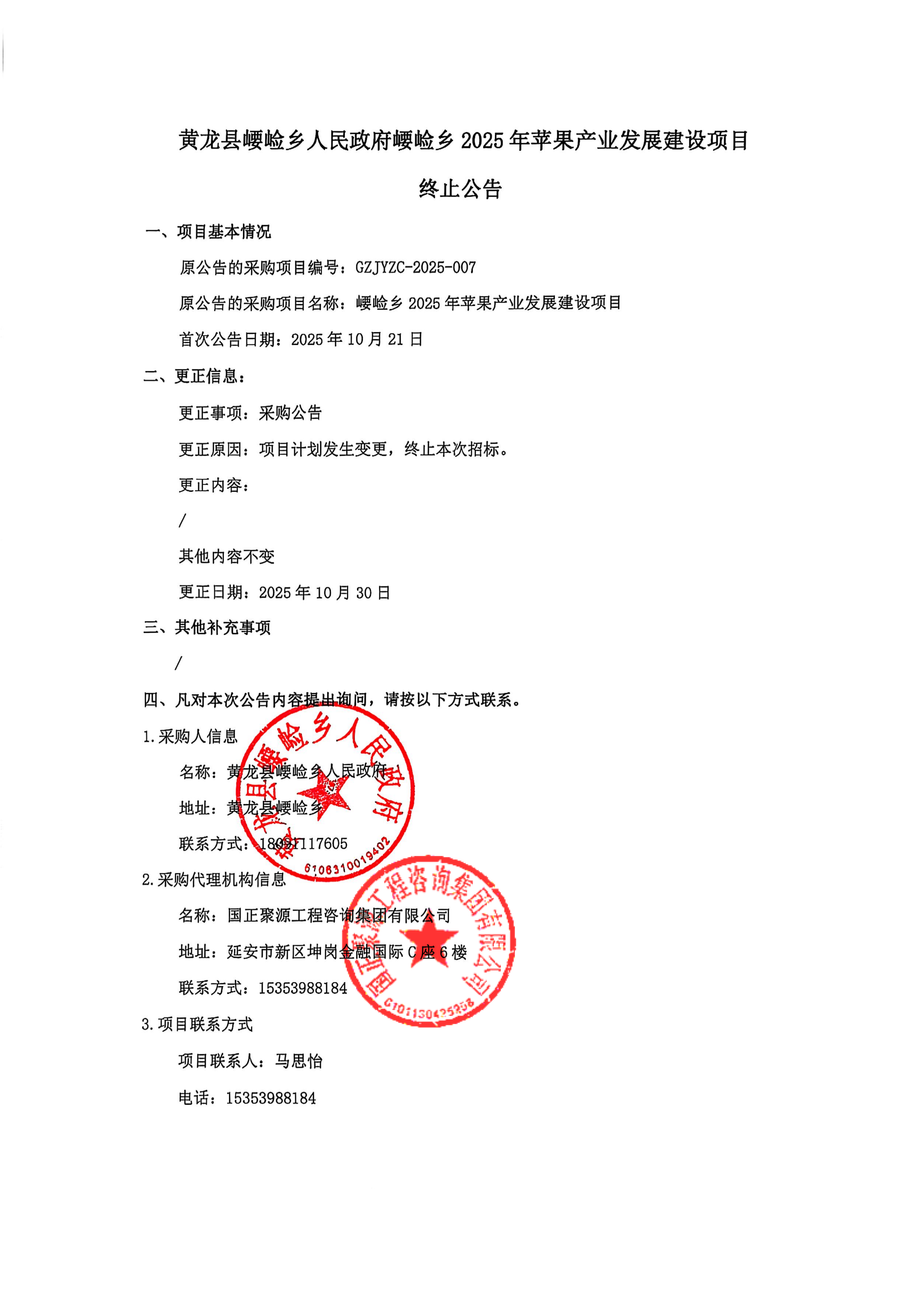更正原因: 项目计划发生变更,终止本次招标。更正内容: