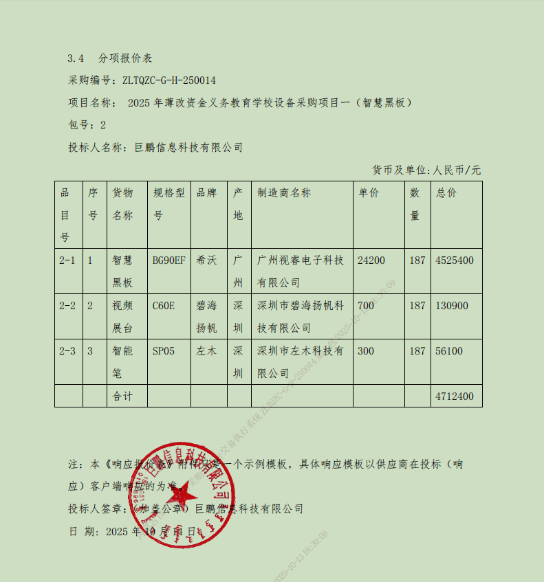 ******学校设备采购项目一(智慧黑板)二标段)中标金额(第1候选人):3,831,069.00元,更正为:4,712,400.00元