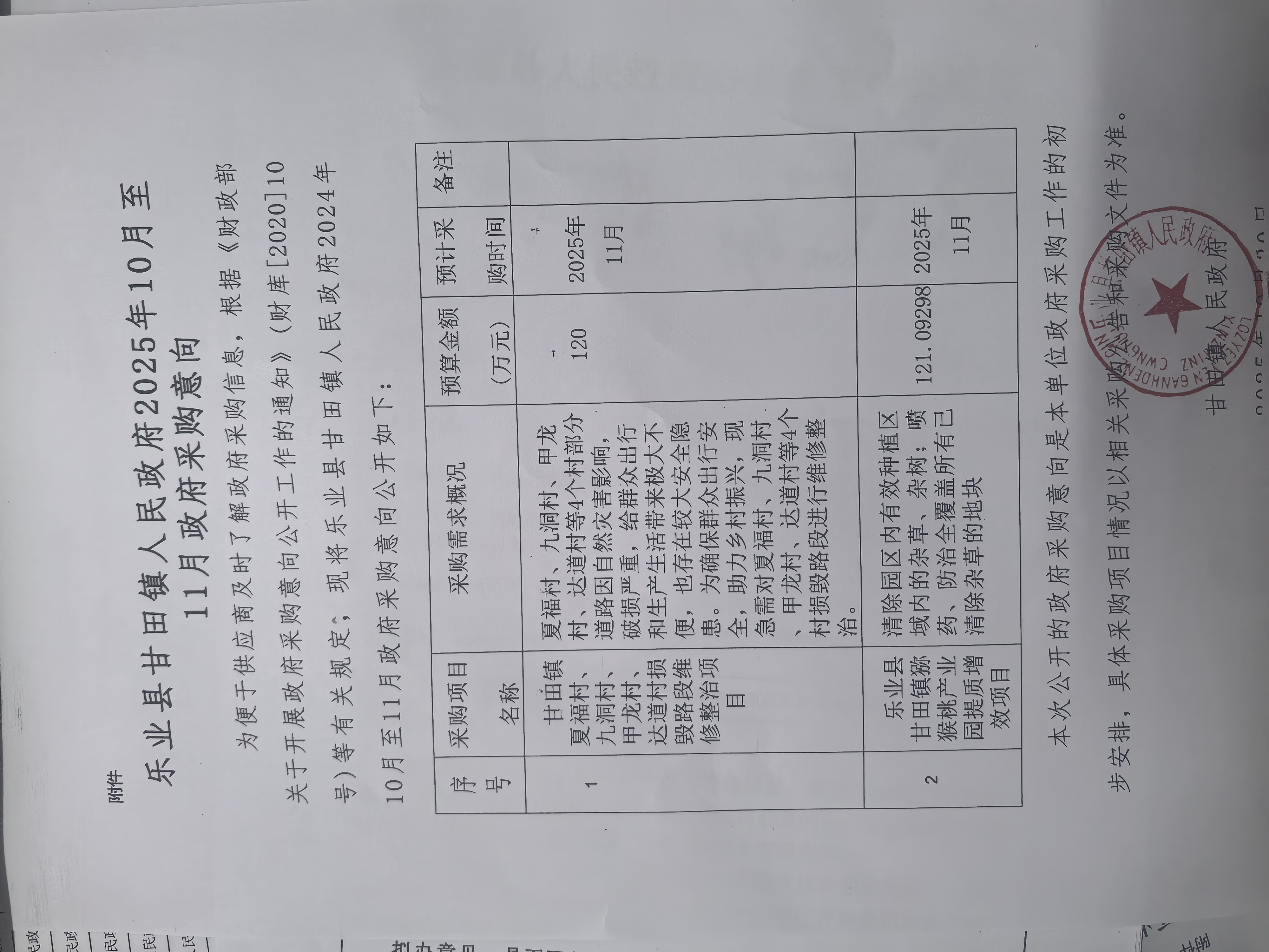 | 1 | 甘田镇夏福村、九洞村、甲龙村、达道村损毁路段维修整治项目 | 夏福村、九洞村、甲龙村、达道村等4个村部分道路因自然灾害影响,破损严重,给群众出行和生产生活带来极大不便,也存在较大安全隐患。为确保群众出行安全,助力乡村振兴,现急需对夏福村、九洞村、甲龙村、达道村等4个村损毁路段进行维修整治。 | 120 | 2025年11月 | 采购限额标准以上,200 万元以下的货物和服务采购项目、400 万元以下的工程采购项目,适宜由中小企业提供的,采购人应当专门面向中小企业采购。 超过 200 万元的货物和服务采购项目、超过400万元的工程采购项目中适宜由中小企业提供的,预留该部分采购项目预算总额的30%以上专门面向中小企业采购,其中预留给小微企业的比例不低于 60% | |